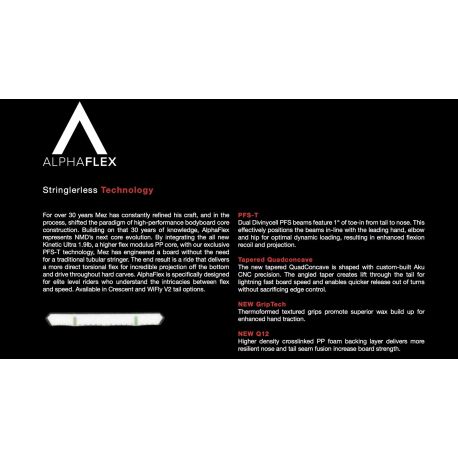 El AlphaFlex representa la última evolución de NMD en diseño de bodyboards. Construido con el nuevo Kinetic Ultra 1.9lb, un núcleo PP de alto módulo de flexión, y combinado con la exclusiva tecnología PFS-T, Mez ha creado una tabla que elimina la necesidad del clásico stringer tubular. El resultado es una tabla que ofrece una flexión torsional más directa, brindando una proyección increíble en los bottom turns y un gran impulso en carvings agresivos. El AlphaFlex está diseñado específicamente para riders avanzados y de élite que buscan el equilibrio perfecto entre flexibilidad y velocidad para un rendimiento máximo.